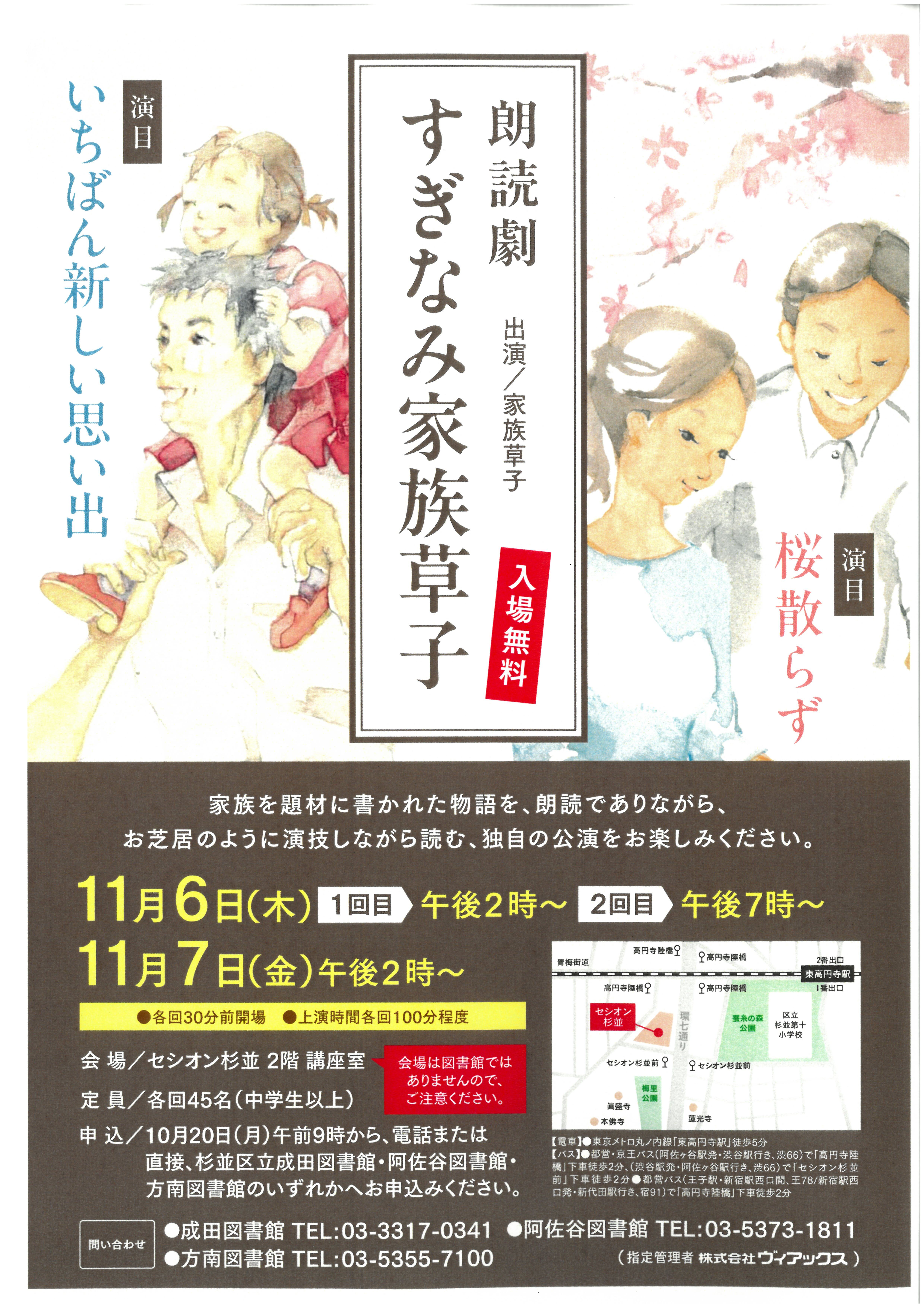 杉並にゆかりのある森浩美氏が主宰・脚本を務める「家族草子」の方に朗読劇をしていただきます。